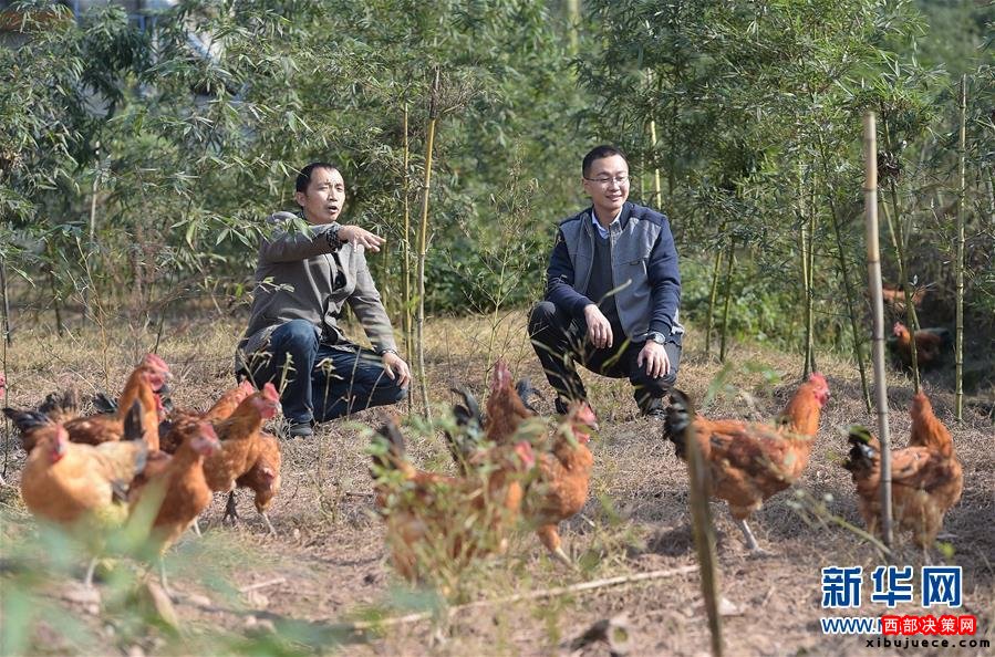 李寶強(qiáng)(右)在一戶百姓家了解林下養(yǎng)雞情況(2015年11月25日攝)。李寶強(qiáng),眉山市青神縣瑞峰鎮(zhèn)天池村“第一書記”。為集中力量打好脫貧攻堅(jiān)戰(zhàn),四川省選派1.5萬名優(yōu)秀機(jī)關(guān)干部到建檔立卡貧困村任職“第一書記”。黨的十八大以來,以習(xí)近平同志為總書記的黨中央高瞻遠(yuǎn)矚、深謀遠(yuǎn)慮,以高度的政治感、使命感和責(zé)任感,把扶貧開發(fā)工作提升至治國(guó)理政新高度,廣泛凝聚社會(huì)各界力量,推進(jìn)實(shí)施精準(zhǔn)扶貧方略,為到2020年全面建成小康社會(huì)奠定堅(jiān)實(shí)基礎(chǔ)。按照中央部署,通過產(chǎn)業(yè)扶持、轉(zhuǎn)移就業(yè)、易地搬遷、政策兜底等方式,到2020年將實(shí)現(xiàn)7017萬農(nóng)村貧困人口脫貧目標(biāo)。新華社記者 薛玉斌 攝
