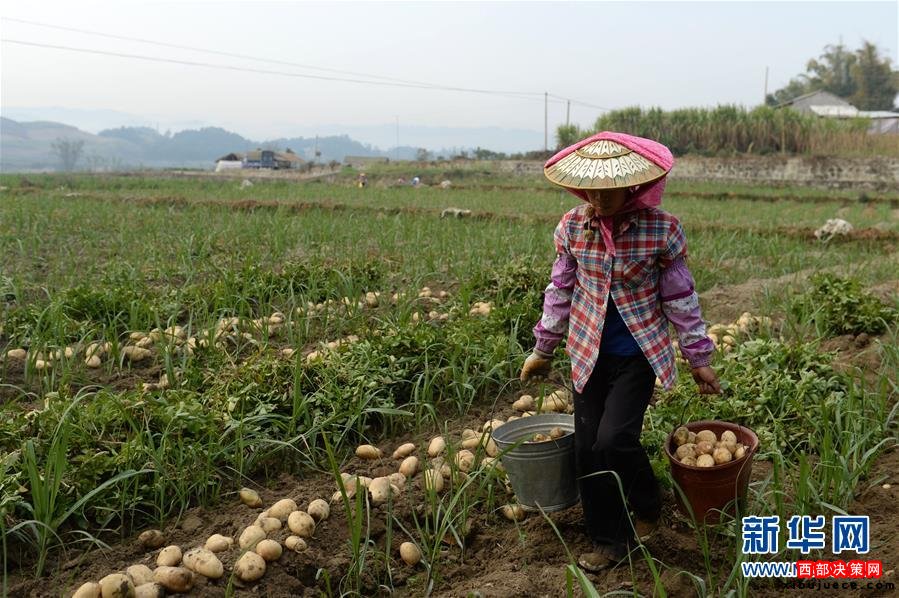 云南省德宏傣族景頗族自治州芒市軒崗鄉(xiāng)農(nóng)民提著采挖好的馬鈴薯準(zhǔn)備前去裝箱。當(dāng)?shù)伛R鈴薯每畝產(chǎn)值近6000元,是村民增收的主要途徑之一(2014年3月21日攝)。近年來,云南省大力推進(jìn)扶貧攻堅(jiān),走出了一條整村、整鄉(xiāng)、整縣、整州推進(jìn)的扶貧開發(fā)新路子。黨的十八大以來,以習(xí)近平同志為總書記的黨中央高瞻遠(yuǎn)矚、深謀遠(yuǎn)慮,以高度的政治感、使命感和責(zé)任感,把扶貧開發(fā)工作提升至治國(guó)理政新高度,廣泛凝聚社會(huì)各界力量,推進(jìn)實(shí)施精準(zhǔn)扶貧方略,為到2020年全面建成小康社會(huì)奠定堅(jiān)實(shí)基礎(chǔ)。按照中央部署,通過產(chǎn)業(yè)扶持、轉(zhuǎn)移就業(yè)、易地搬遷、政策兜底等方式,到2020年將實(shí)現(xiàn)7017萬農(nóng)村貧困人口脫貧目標(biāo)。新華社記者 胡超 攝