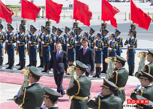 8月31日,國務院總理李克強在人民大會堂東門外廣場為特魯多舉行歡迎儀式。