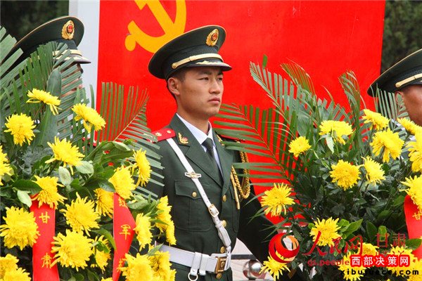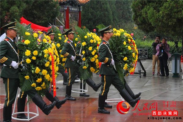 甘肅省領(lǐng)導(dǎo)和各界群眾代表向會師紀念塔敬獻花籃