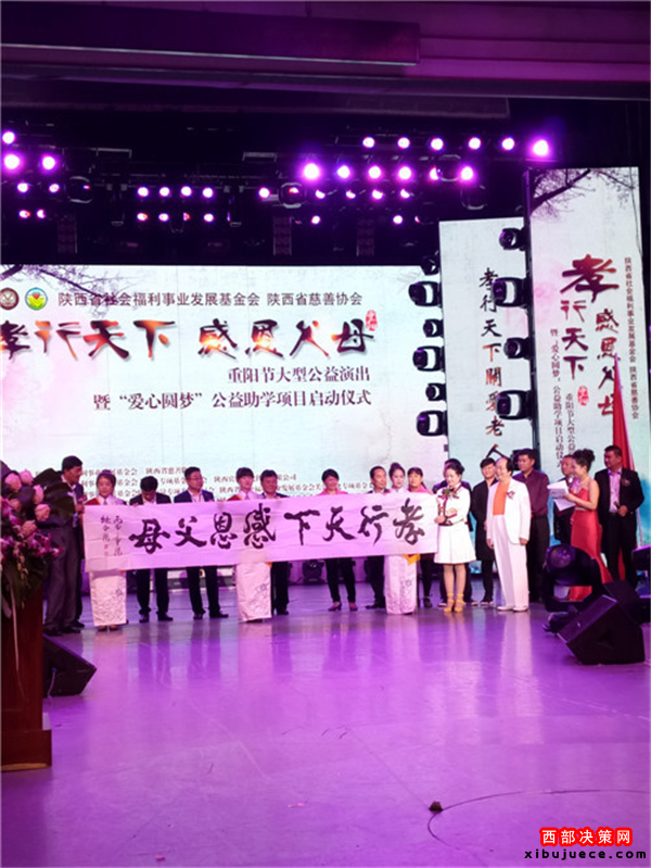 西部決策網(wǎng)訊 我國傳統(tǒng)的節(jié)日“九九重陽”也是“老人節(jié)”。值此佳節(jié)良晨,在西安金翅鳥演藝隆重舉行了由陜西省民政廳指導(dǎo),陜西省社會福利事業(yè)發(fā)展基金會攜手陜西省慈善協(xié)會聯(lián)合主辦,陜西省社會福利發(fā)展基金會主持人專項基金委員會、陜西賓悅文化傳媒有限公司承辦,以及陜西省社會福利事業(yè)發(fā)展基金會陜北力量專項基金委員會、陜西省社會福利事業(yè)發(fā)展基金會關(guān)公文化專項基金委員會、陜西省社會福利事業(yè)發(fā)展基金會陜北民歌專項基金委員會、陜西省社會福利事業(yè)發(fā)展基金會影視文化專項基金委員會聯(lián)合協(xié)辦的“孝行天下感恩父母”大型公益演出暨“愛心圓夢”公益助學(xué)項目隆重啟動。