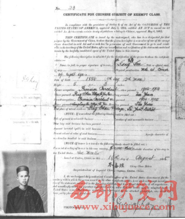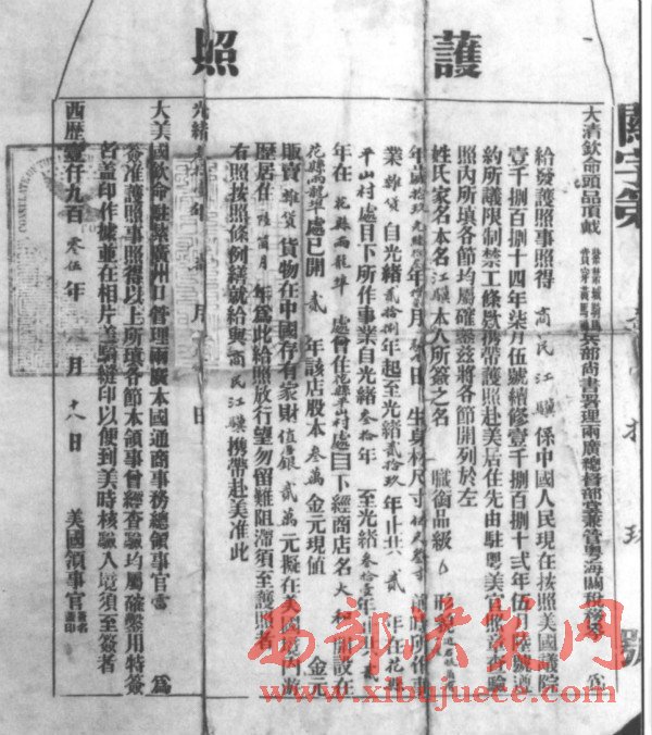 如此看來(lái),他是一位了不起的地方富商。江驥的太和商店主要經(jīng)營(yíng)雜貨貿(mào)易。因此,他向廣州政府申請(qǐng)去美國(guó)游歷,開開眼界。雖然1905年是美國(guó)百年排華運(yùn)動(dòng)的高潮年,而且美國(guó)政府明令禁止“華工”入境。就在江驥申請(qǐng)游美護(hù)照的前一個(gè)月,中國(guó)爆發(fā)了聲勢(shì)浩大的抵制美貨運(yùn)動(dòng),其目的就是抗議美國(guó)壓迫華僑。但是,美國(guó)是允許中國(guó)商人入境游歷的,像江驥這樣的廣州富商,更是歡迎。所以,兩廣總督岑春煊會(huì)同美國(guó)駐廣州總領(lǐng)事雷伏禮在1905年8月18日分別在江驥的中國(guó)護(hù)照了簽名,準(zhǔn)許其赴美游歷。
