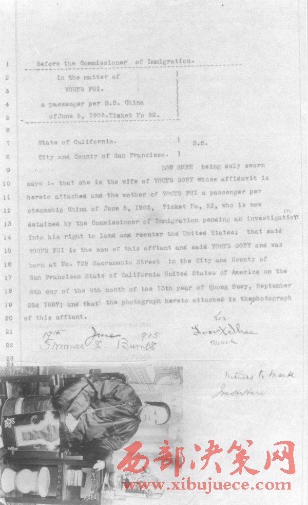 1905年6月5日,美國(guó)舊金山移民局官員對(duì)一位中國(guó)華僑的婦女入境資格的審查證明