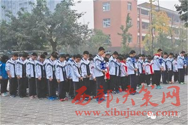 在晨霧中,崇慶中學的師生們?yōu)橛嘈衲?,三分鐘后,同學們走向敬賢樓,向余旭的遺像獻花。在一米多高的照片中,余旭一身戎裝,神采飛揚。