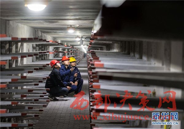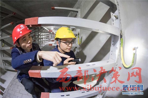 11月24日,解放碑地下環(huán)形電力隧道的一段支線電力隧道內(nèi),兩名國網(wǎng)重慶市區(qū)供電公司的技術(shù)人員(右一、右二)在對(duì)預(yù)留的商業(yè)用戶接入隧道的電力設(shè)施設(shè)備進(jìn)行竣工驗(yàn)收。當(dāng)日,經(jīng)過3年多的緊張建設(shè),重慶地下環(huán)形“電力高速路”——解放碑地下環(huán)形電力隧道工程順利通過竣工驗(yàn)收,并正式投入運(yùn)行。解放碑環(huán)形電力隧道總長2408米,其中1198米的干線電力隧道已經(jīng)成功接入解放碑商圈及周邊地區(qū)的4個(gè)110千伏變電站形成環(huán)線,支線電力隧道1210米也開始陸續(xù)接入用戶。據(jù)介紹,作為重慶市重點(diǎn)工程,2013年7月開工建設(shè)的解放碑地下環(huán)形電力隧道按照滿足未來20年電力需求設(shè)計(jì),隧道高2.8米、寬2.4米,投入運(yùn)行后將解決重慶渝中半島和重慶最繁華的解放碑商業(yè)區(qū)配電設(shè)施老化、無法擴(kuò)建等問題,使解放碑商圈供電負(fù)荷承載能力得到極大加強(qiáng)。