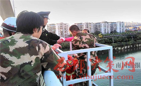 此時,阿建已經趕到橋頭,民警立即讓他先在遠處等候,不要讓阿婷看見。通過阿建提供的電話號碼,民警聯系上了阿婷的父親,把電話撥通之后遞給阿婷,由其父親進行勸說。此時,在旁的消防官兵綁好救生繩索開始伺機出手。