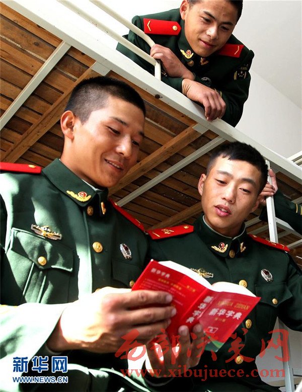 12月5日,艾麥爾·吾斯曼(左一)在連隊戰(zhàn)友的幫助下學習漢語。