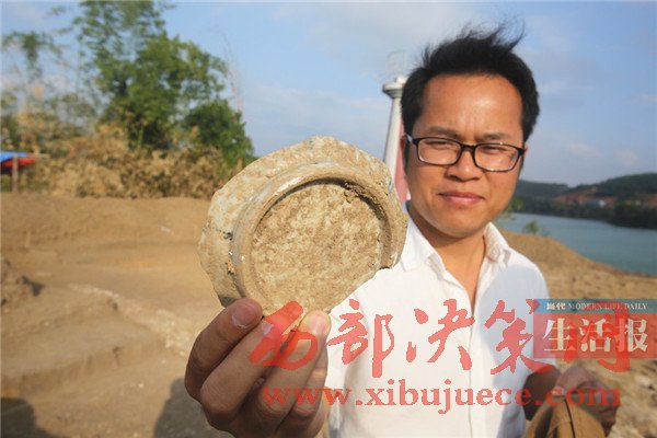 在現(xiàn)場,一工作人員給記者展示了一枚剛出土的銅錢,該枚銅錢只有人的食指般大小。據(jù)工作人員介紹,像這類的銅錢目前已經(jīng)發(fā)掘出了十枚,銅錢散落在發(fā)掘遺址的各個角落,除了銅錢外,考古人員還揭露了部分青磚砌筑的建筑基址,地層中也出土了少量的生活用陶瓷殘片。由此推斷,鎮(zhèn)江樓遺址在清代時曾有人住宿和生活過,這和史料中關(guān)于鎮(zhèn)江樓常設(shè)駐軍的記載相符。據(jù)黎文宗介紹,2014年時考古隊曾對鎮(zhèn)江樓遺址進行全面調(diào)查,2016年開始試掘,此前,鎮(zhèn)江樓遺址因受左江南岸河岸崩塌以及老口樞紐建成水位抬升的影響,三江口鎮(zhèn)江樓遺址面臨崩塌、消亡的危險。