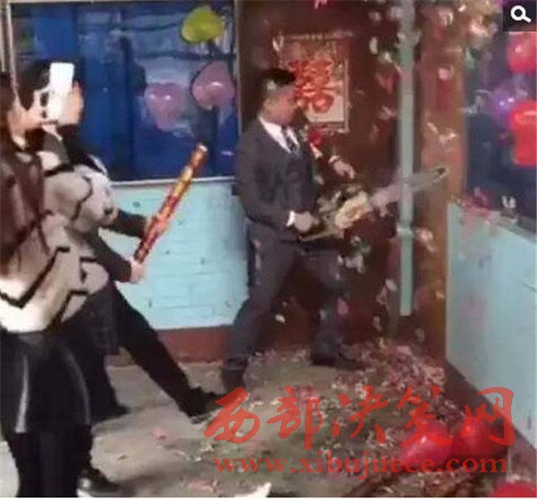 伴娘擋在門前,向新郎要紅包,一定要數(shù)目夠大才肯開門?,F(xiàn)場的伴郎團把伴娘拉下去,新郎撿起了地上的一把電鋸,這是要干什么呢?