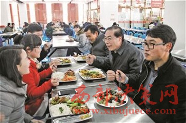 圖為于叢樂(右二)與學(xué)生一起在學(xué)院食堂共進午餐