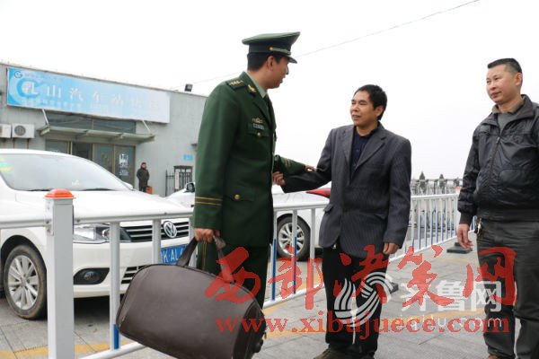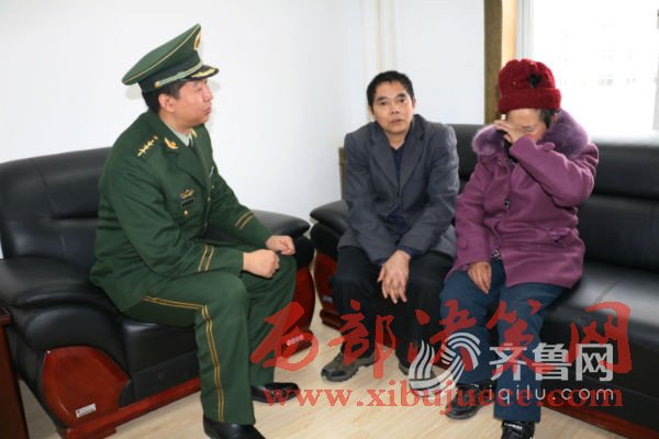 1月9日,周開(kāi)樹(shù)在南黃邊防派出所為母親開(kāi)具無(wú)戶(hù)籍證明后,然后帶母親來(lái)到青島,當(dāng)天下午坐上了青島至成都的火車(chē),坐在火車(chē)上,周開(kāi)樹(shù)的眼前又浮現(xiàn)出當(dāng)年的情景,一個(gè)11歲的少年,緊緊拉著母親的手:“媽媽?zhuān)鷦e走,長(zhǎng)大后我養(yǎng)活您……”圖為周開(kāi)樹(shù)與南黃邊防派出所民警見(jiàn)面。