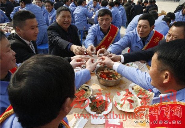 張興民介紹,在為大家發(fā)放了1600萬的工資后,工地上還為農(nóng)民工返鄉(xiāng)之前準(zhǔn)備了聚餐。每個桌上不僅有自釀的“苞谷燒”,還有八涼兩熱的菜品,同時按照陜西風(fēng)俗習(xí)慣準(zhǔn)備的有大燴菜,僅大燴菜里面的肉都有500多斤,希望以此方式來感謝農(nóng)民工兄弟一年多的辛苦!