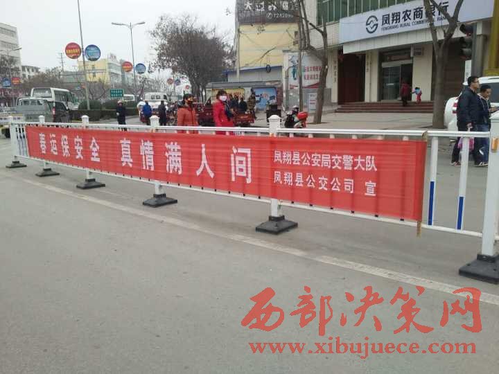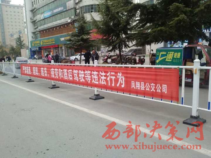 西部決策網(wǎng)訊(帥華鋒 李亮亮 通訊員 孟歡)為切實(shí)做好2017年春運(yùn)期間道路交通安全宣傳工作,引導(dǎo)群眾安全、文明出行,營造和諧、平安的春運(yùn)道路交通安全氛圍。近日,鳳翔大隊(duì)根據(jù)汽車客運(yùn)站、鎮(zhèn)街要道春運(yùn)期間人流車流量較大的特點(diǎn),將印有“文明交通你我他,平安出行靠大家”、“祝千家萬戶家家團(tuán)圓 愿四方旅客路路平安”、“秩序保障安全,規(guī)則守護(hù)生命”、“滴酒不沾,一路平安”等交通安全宣傳標(biāo)語的橫幅懸掛在東大街、南大街、東大街、秦鳳路等主干道防護(hù)欄醒目位置,為春運(yùn)安全行駛營造濃厚的宣傳氛圍。