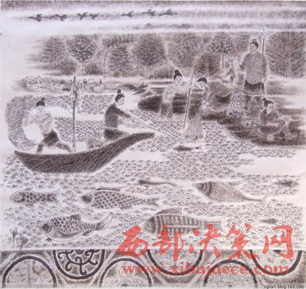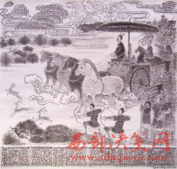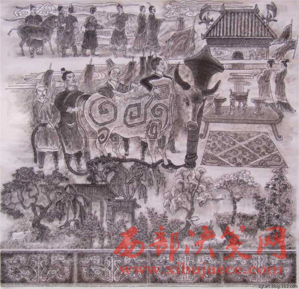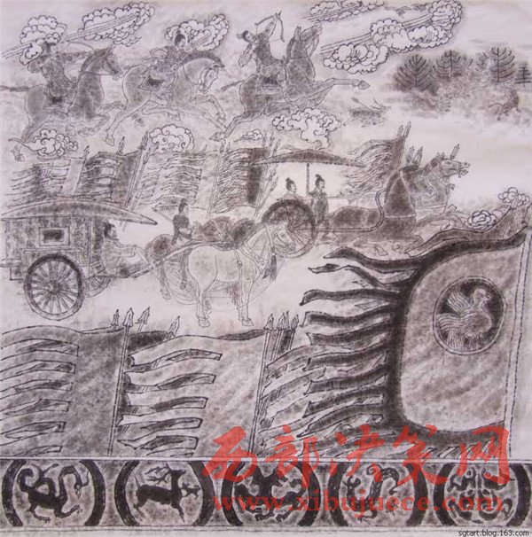 曹老經(jīng)過深思熟慮后1989年作出第一幅石鼓畫像,但他并不滿意。石鼓文的博大精深、源遠流長豈能是他輕易能描繪得出來的!他覺得自己還沒有吃準石鼓文的深邃含義。他明白:淺薄自滿是藝術(shù)的致命傷,能對自己自省和不滿的人,才會創(chuàng)作出能經(jīng)得起時間和歷史檢驗的藝術(shù)佳作。曹老痛下心撕了又畫,兩易其稿后,心里還不踏實,他必須尋找“最為挑剔的眼睛”。于是,他帶著十幅畫作,趕赴京城,讓石鼓專家鑒定審核。果不其然,專家們給他指出了一些問題:畫的時間不對,人物衣著不符合朝代特征。曹老虛心聽取了專家的意見,他返回寶雞,廢棄了原稿,重新考證人物的歷史特征,生活細節(jié)的一點一滴。他為了能精確地描繪先秦時期的人物和服飾,甚至每一件物件、器皿、圖案,他借來了秦兵馬俑博物館的圖像和資料,依據(jù)兵馬俑中人物的衣著打扮,紋飾車馬,2000年之后,第三次拿起筆重新準確地描繪出了十面石鼓中的眾多人物、眾多民俗風情。為了讓《石鼓文圖》經(jīng)受更嚴格的“審批”,曹老并沒有急于發(fā)表,而是連續(xù)奔波了幾年,直到2007年終于定稿與世人見面。