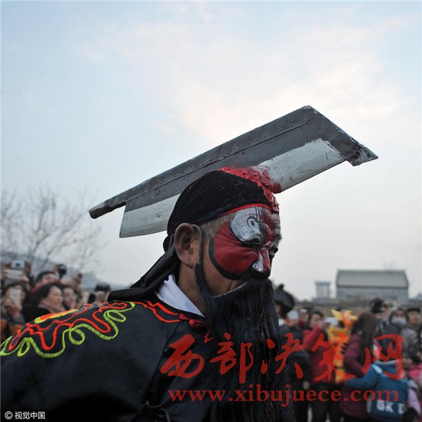 刀具化妝非常神速,一個人的化妝也就三五分鐘,很快就從棚子中走出進(jìn)入表演現(xiàn)場。一名血社火傳承人介紹:“血社火的秘密就在化妝,而且我們歷來傳男不傳女,更不能隨便向外人透露”。