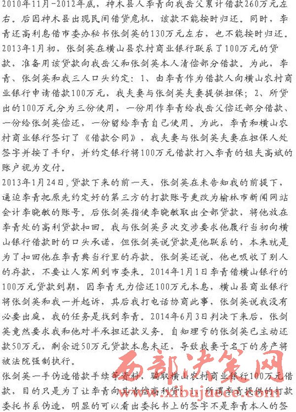 網(wǎng)友微信公眾號(hào) 江嶼濯浪爆料 2010年11月-2012年底,神木縣人李青向我岳父累計(jì)借款260萬(wàn)元左右。后因神木縣出現(xiàn)民間借貸危機(jī),該款不能按時(shí)歸還。同時(shí),李青還高利息借市委辦秘書張劍英的130萬(wàn)元左右,也不能按時(shí)歸還。2013年1月初,張劍英在橫山縣農(nóng)村商業(yè)銀行聯(lián)系了100萬(wàn)元的貸款,準(zhǔn)備用該貸款向我岳父和張劍英本人清償部分借款。為此,李青、張劍英和我三人口頭約定:1、由李青作為借款人向橫山農(nóng)村商業(yè)銀行申請(qǐng)借款100萬(wàn)元,我夫妻與張劍英夫妻提供擔(dān)保;2、所貸出的100萬(wàn)元分為三份使用,一份用作李青給我岳父償還部分借款、一份給張劍英償還,一份留給李青自己使用。為此,李青和橫山農(nóng)村商業(yè)銀行簽訂了《借款合同》,我夫妻與張劍英夫妻在擔(dān)保人處簽字并按了手印,并約定銀行將100萬(wàn)元借款打入李青的姐夫高斌的賬戶視為交付。