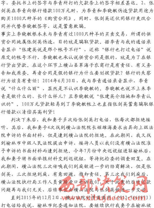 判決下來(lái)后,我和妻子多次給張劍英打電話,張每次都拒絕接聽(tīng),其后,我和妻子4次找到橫山法院院長(zhǎng)姬雄海要求出具向上級(jí)法院申訴的書面材料,但是遭到橫山法院的拒絕。在此期間,我又找到榆林市中級(jí)人民法院提出申訴,接待人員以我們沒(méi)有橫山法院準(zhǔn)予申訴的書面材料而遭到拒絕。今年7月份中央巡視組進(jìn)駐榆林后,我和妻子將書面舉報(bào)材料交到巡視組,等待紀(jì)檢委的調(diào)查回復(fù)。在此期間,橫山法院三次傳喚我們到庭做進(jìn)一步的協(xié)商解決,但是張劍英,三次拒絕到庭,有意回避,推卸責(zé)任。第三次我們到庭后,橫山法院執(zhí)行局工作人員黃騰親口告訴我們,關(guān)于此案的后續(xù)還款問(wèn)題再與我們無(wú)關(guān),后續(xù)事宜由橫山法院與張劍英做進(jìn)一步交涉。
