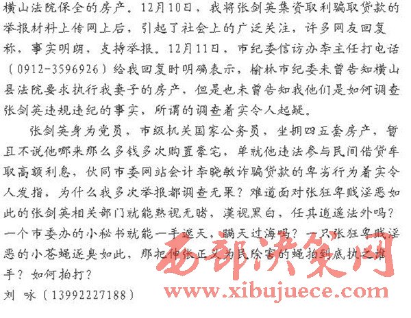 直到2015年的12月2日,橫山法院的羅某某用(0912-7660873)打電話給我說(shuō),榆林市紀(jì)委通知法院,要繼續(xù)執(zhí)行我妻子在榆林被橫山法院保全的房產(chǎn)。12月10日,我將張劍英集資取利騙取貸款的舉報(bào)材料上傳網(wǎng)上后,引起了社會(huì)上的廣泛關(guān)注,許多網(wǎng)友回復(fù)稱,事實(shí)明朗,支持舉報(bào)。12月11日,市紀(jì)委信訪辦李主任打電話(0912-3596926)給我回復(fù)時(shí)明確表示,榆林市紀(jì)委未曾告知橫山縣法院要求執(zhí)行我妻子的房產(chǎn),但是也未曾告知我他們是如何調(diào)查張劍英違規(guī)違紀(jì)的事實(shí),所謂的調(diào)查著實(shí)令人起疑。