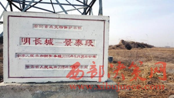 省政府立的明長城景泰段全國重點(diǎn)文物保護(hù)碑。 本文圖均為 甘肅日報(bào) 圖春節(jié)期間,記者來到這段明長城后看到,這段由黃土夯筑而成的長城,在歷經(jīng)400多年的風(fēng)雨侵蝕和人為破壞后,已成為斷斷續(xù)續(xù)、高低不一的“土壟子”。即便間或殘存有一大段連續(xù)的城墻,也被兩側(cè)的農(nóng)田“啃噬”得只剩下一兩米高寬。