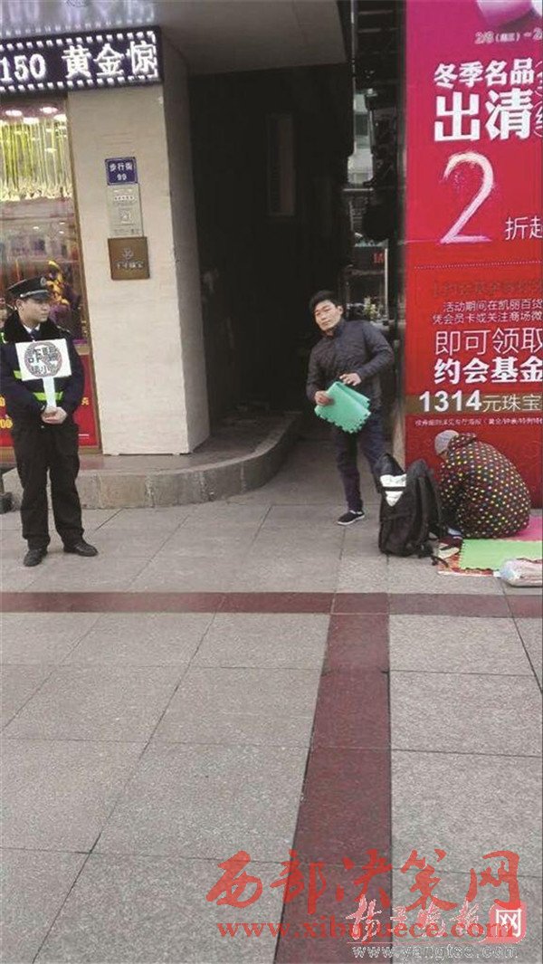 元宵節(jié)當(dāng)天,張家港沙洲路步行街一商場(chǎng)樓下,一名年輕男子以母親患重病為由跪地乞討,"母親"就躺在地上,旁邊站著一名城管協(xié)管員,舉起了寫著"詐騙請(qǐng)小心"的牌子。被攪了局的"行乞者"最后只能逃之夭夭。據(jù)當(dāng)事城管協(xié)管員介紹,乞討男子是個(gè)"熟面孔",當(dāng)天曾躲進(jìn)小弄堂里抽煙打電話,用的是蘋果手機(jī),抽的是中華煙,這讓他們更加確信,男子是職業(yè)行乞,根本不是家中有困難。揚(yáng)子晚報(bào)全媒體記者於蘇云