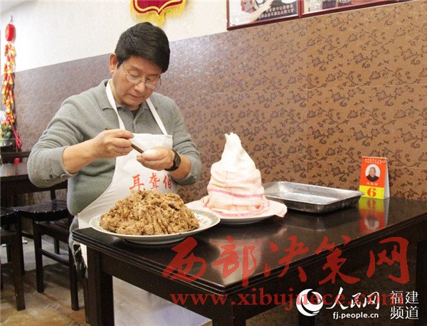 “我父親那一代,凌晨兩三點就爬起來浸米,回去休息幾個小時,五六點再起來用石磨磨米漿……”一說起元宵,跟元宵打了一輩子交道的林英德就滔滔不絕,“肉呢也有講究,上等的豬腿肉,剔干凈筋、皮等雜質(zhì)后再調(diào)味。”