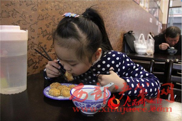 小女孩在老店里享用美食。