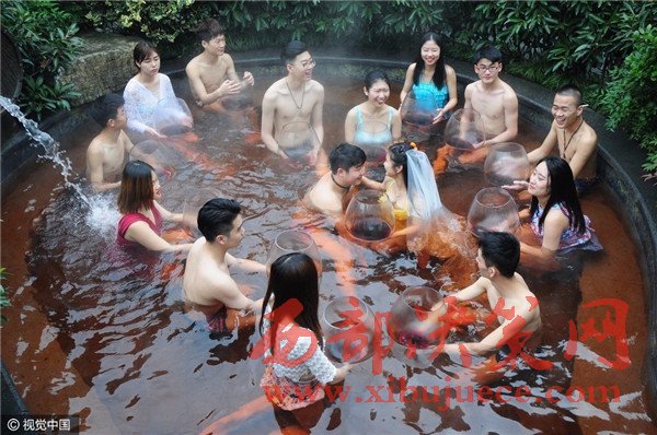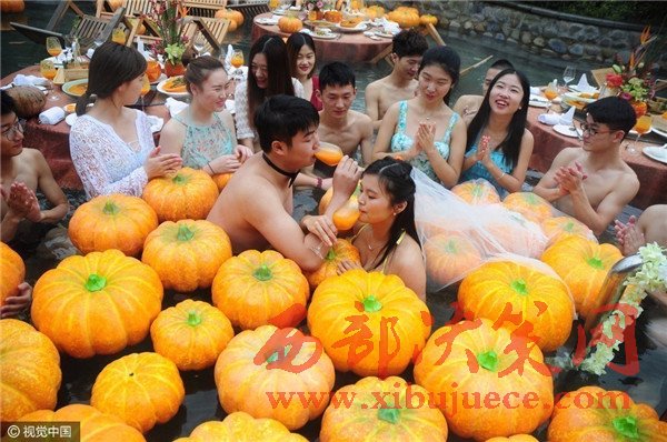 現(xiàn)場賓客都泡在溫泉里,婚宴食材都是用南瓜制成。