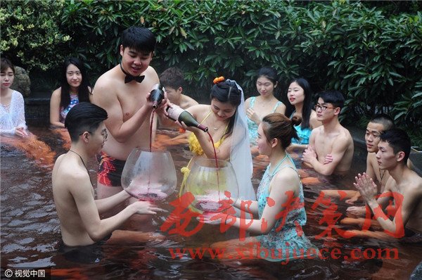 新郎周天中、新娘張婷都來自杭州蕭山,他倆相識結緣于一次游玩中,覺得在溫泉舉行婚禮頗有意義。圖為新娘喂新郎喝超大杯紅酒。