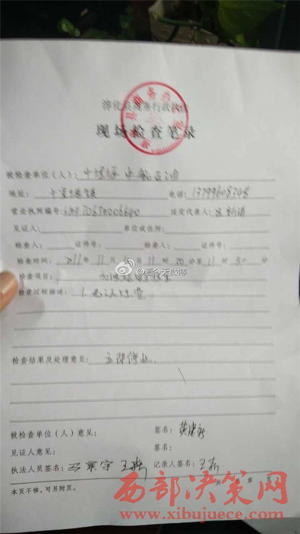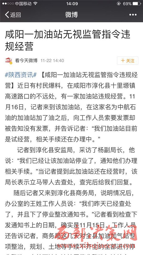 記者到淳化縣安監(jiān)局,采訪了楊副局長,他說:“我們已經(jīng)讓該加油站停業(yè)了,通知他們辦理相關手續(xù)。”當記者提到此加油站還在經(jīng)營時,該局長表示立馬帶人去查處,查完后給我們回復。隨后記者又來到淳化縣商務局,說明情況后,辦公室的王姓工作人員說:“我們昨天已經(jīng)查處了,并且下了停業(yè)整改通知書。”記者看到檢查下發(fā)通知書上的日期,確實是11月15日。