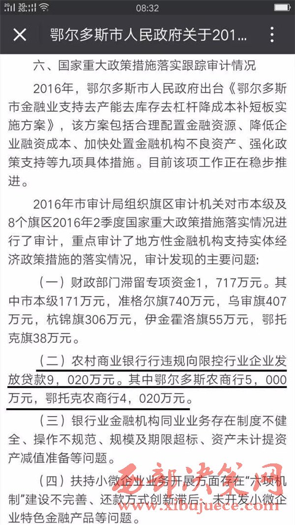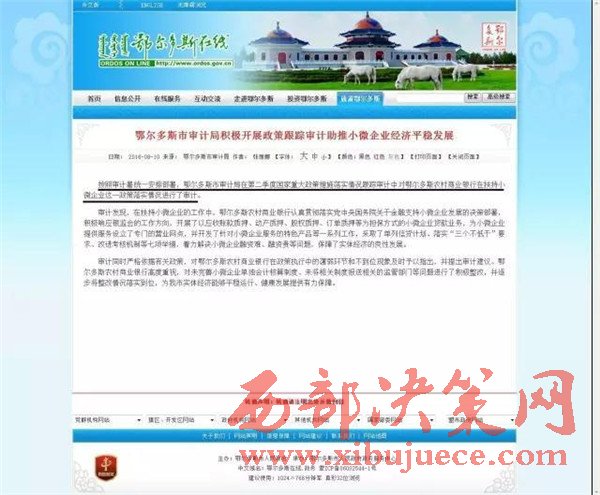 鄂爾多斯市人民政府網(wǎng)站刊登文章中稱:按照審計署統(tǒng)一安排部署,鄂爾多斯市審計局在第二季度國家重大政策措施落實情況跟蹤審計中對鄂爾多斯農(nóng)村商業(yè)銀行在扶持小微企業(yè)這一政策落實情況進(jìn)行了審計。