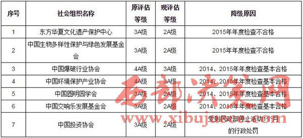 民政部14日發(fā)布公告,根據(jù)《社會組織評估管理辦法》第三十條關(guān)于獲得評估等級的社會組織有上年度年度檢查不合格、連續(xù)2年年度檢查基本合格或受相關(guān)政府部門行政處罰情形的,由民政部門作出降低評估等級處理的規(guī)定,決定對東方華夏文化遺產(chǎn)保護中心、中國生物多樣性保護與綠色發(fā)展基金會、中國爆破行業(yè)協(xié)會、中國環(huán)境保護產(chǎn)業(yè)協(xié)會、中國圓明園學(xué)會、中國交響樂發(fā)展基金會、中國投資協(xié)會等7家社會組織降低評估等級。