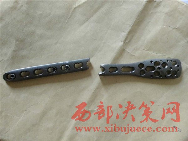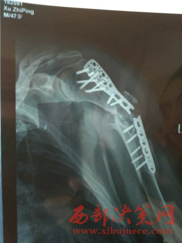 在當(dāng)時的手術(shù)當(dāng)中院方告知患者手術(shù)中采用的是鈦合金鋼板,當(dāng)時的報價為15800元,術(shù)后未發(fā)現(xiàn)什么異常故住院18天后出院。時隔1年半到2016年年底,來到榆林星元醫(yī)院準(zhǔn)備拆鋼板時,通過XT片后發(fā)現(xiàn)鋼板是斷裂的,固定鋼板的13個鋼釘也全部斷裂,肱骨也未長好,所以不得不再進(jìn)行二次手術(shù),將原來的鋼板拆除,再做一次手術(shù),再一次將19個鋼釘打在了自己的左胳膊上。