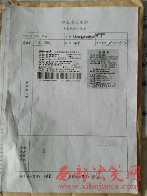 患者家屬將原來在博仁醫(yī)院住院的資料全部拿出來時發(fā)現(xiàn),大保當(dāng)博仁醫(yī)院當(dāng)時給患者做手術(shù)所用的鋼板可能存在問題,做手術(shù)所用的鋼板與當(dāng)時給患者提供的合格證書不符,在此期間家屬也找過原博仁醫(yī)院劉院長,所給的答復(fù)是他剛來不知道此事,董事長(賀玉剛)也說是在西安,你們先看病,回頭把鋼板拿過來,等鋼板廠家的人來了,我們?nèi)阶谝黄鹂丛趺唇鉀Q,就這樣一直拖著直到現(xiàn)在。