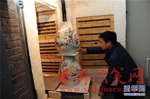 3月24日,在北京京彩瓷博物館里,技師李建強(qiáng)將工藝美術(shù)師們畫(huà)好的作品《百鹿尊》推進(jìn)電窯里,準(zhǔn)備燒制。