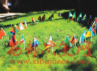 南南學(xué)院院內(nèi)的草地上插著20多個(gè)國(guó)家的小國(guó)旗。