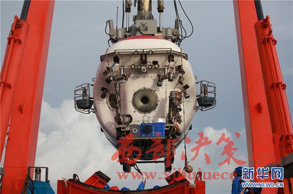 5月23日,“蛟龍”號完成下潛后回收到“向陽紅09”科學(xué)考察船上。
