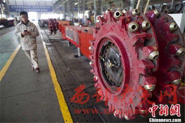 圖為山西太重工人從采煤機(jī)前經(jīng)過。