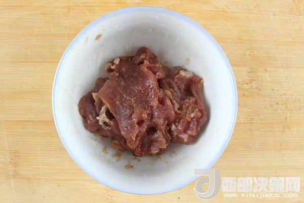 2.瘦肉切片,用少許醬油和黃酒抓一下,再放少許干淀粉和蛋清抓勻備用