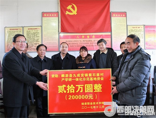 12月15日,為為貫徹落實(shí) 《全省脫貧攻堅(jiān) 2017冬季行動(dòng)方案》精神,扎實(shí)推進(jìn)高校結(jié)對(duì)幫扶“雙百工程”,有效地為當(dāng)?shù)靥厣a(chǎn)業(yè)服務(wù),楊凌職業(yè)技術(shù)學(xué)院黨委書記趙曼、黨委副書記任得元一行來到麟游縣九成宮鎮(zhèn)紫石崖村,為該村捐贈(zèng)20萬元,用于建立中蜂養(yǎng)殖產(chǎn)學(xué)研一體化示范基地、核桃豐產(chǎn)栽培產(chǎn)學(xué)研一體化示范基地及電商網(wǎng)絡(luò)平臺(tái)。