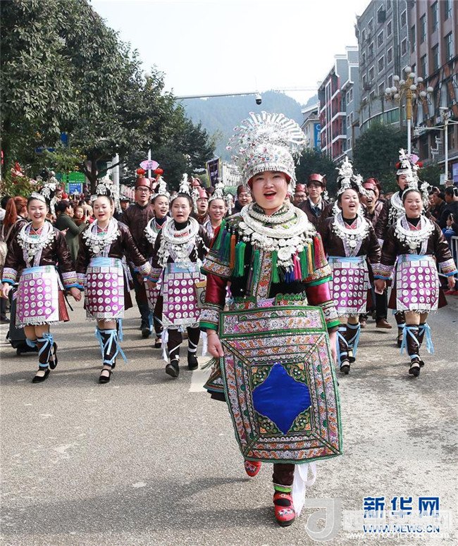 12月18日,身著盛裝的侗族同胞參加巡游。當日,2017中國侗年暨第八屆黎平·中國侗文化旅游節(jié)“非遺”文化巡游在貴州省黔東南苗族侗族自治州黎平縣舉行,當?shù)囟弊逋麣g聚一堂,喜迎侗年到來。(楊代富 攝)