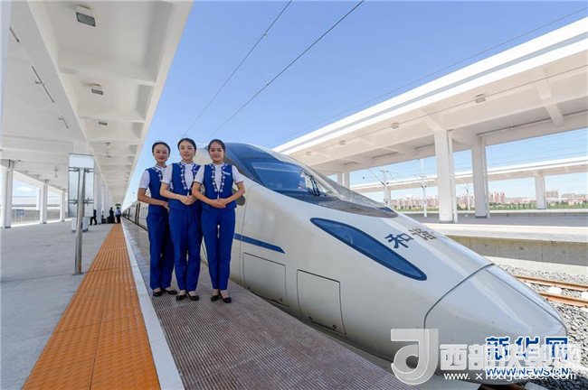 乘務(wù)組人員在烏蘭察布站與動車組合影(8月3日攝)。8月3日,內(nèi)蒙古首列高鐵D6980次列車伴隨著嘹亮的汽笛聲,駛出呼和浩特東火車站,以250公里的時速駛向烏蘭察布站,內(nèi)蒙古自此正式邁進(jìn)高鐵時代。