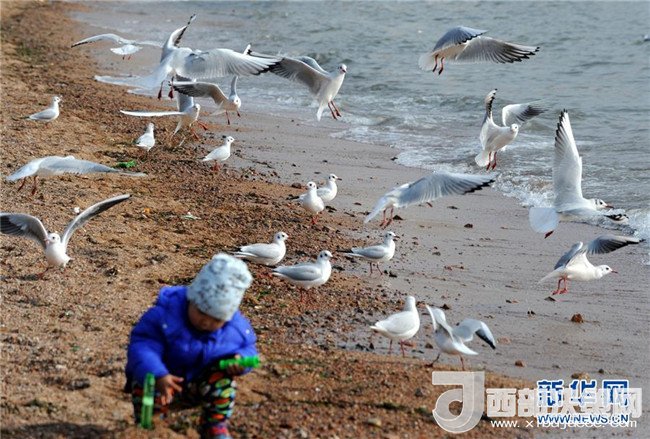 12月28日,一名小男孩在青島棧橋景區(qū)附近沙灘上玩耍。每到冬季,大批海鷗從西伯利亞等地飛臨青島越冬避寒,它們多集中停留在青島沿海一線,吸引眾多市民和游客前來觀賞和拍攝。(記者 李紫恒 攝)