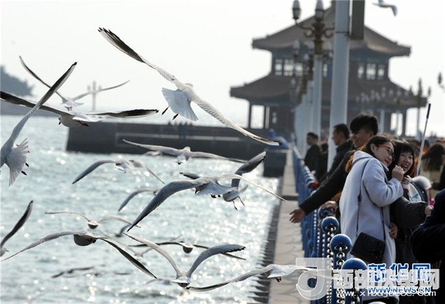12月28日,游客在青島棧橋景區(qū)觀賞海鷗。每到冬季,大批海鷗從西伯利亞等地飛臨青島越冬避寒,它們多集中停留在青島沿海一線,吸引眾多市民和游客前來觀賞和拍攝。 (記者 李紫恒 攝)