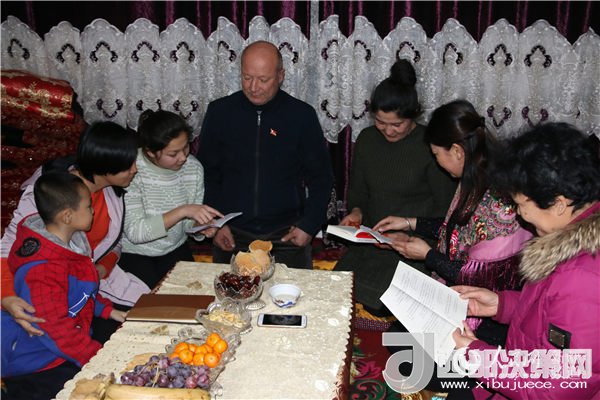 2017年12月30日,新疆吐魯番市托克遜縣第一中學(xué)三名任課教師來(lái)到初三學(xué)生蘇爾婭·巴克爾(左三)家中開展“住家式”家訪,同吃同住同學(xué)習(xí),共學(xué)黨的十九大精神。阿爾達(dá)克 攝