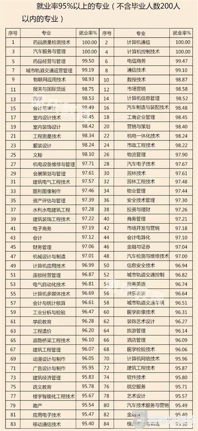 即將畢業(yè),你找到中意的工作了沒?近日,重慶市教委發(fā)布《重慶市2017屆普通高校畢業(yè)生就業(yè)情況報告》。據(jù)統(tǒng)計,2017年,全市共有普通高校畢業(yè)生約21.49萬人,截至2017年8月31日,我市2017屆普通高校畢業(yè)生就業(yè)率為89.65%,與2016屆同比上升0.56%。記者了解到,控制工程專業(yè)、藥品質(zhì)量檢測技術(shù)、汽車服務(wù)與管理等專業(yè),其就業(yè)率達(dá)100%。哪個專業(yè)就業(yè)前景“低調(diào)卻奢華”?哪個專業(yè)只是“看上去很美”?趕緊往下看吧!