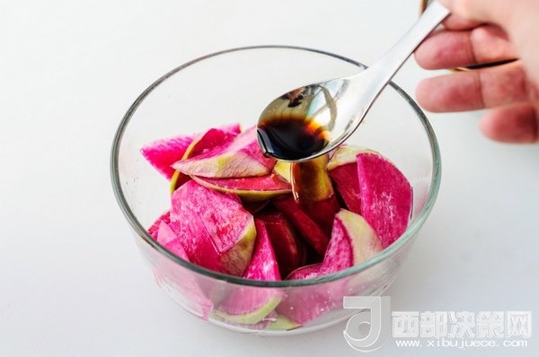 紅心蘿卜如果直接生吃過于單調(diào)了,用一點(diǎn)紅糖,少許陳醋調(diào)成汁把蘿卜浸泡了吃,口感層次豐富,營養(yǎng)和顏值也提升了一檔。紅糖溫中補(bǔ)血還可中和陳醋的酸澀,這樣調(diào)成的酸甜汁適合冬天做涼拌菜使用。