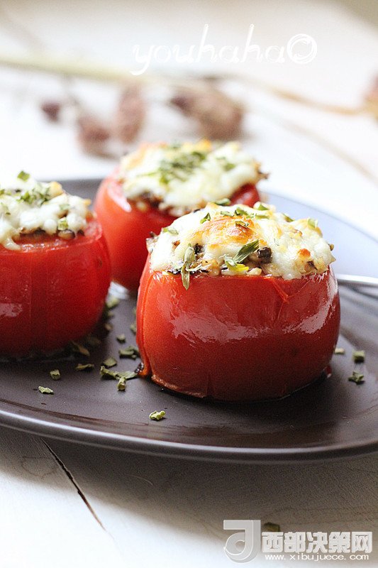 7、到時取出烤盤,西紅柿裝盤,撒少許的干蔥即可。