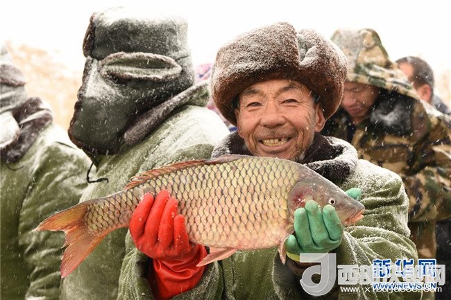 1月6日,在內蒙古杭錦后旗鴻雁湖,捕魚人展示捕撈上來的魚。(支茂盛 攝)
