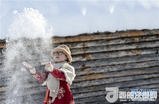 一位游客正在新疆喀納斯禾木村美麗峰腳下的“迪娜小屋”里玩雪(1月2日攝)。記者 趙戈 攝