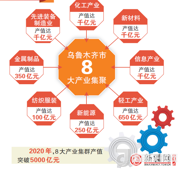 根據(jù)《關(guān)于加快烏魯木齊市工業(yè)重點(diǎn)產(chǎn)業(yè)集群發(fā)展的意見(jiàn)》,烏市將加快發(fā)展化工、先進(jìn)裝備、新材料、新能源、信息、輕工業(yè)、金屬制品、紡織服裝八大產(chǎn)業(yè)集群及產(chǎn)業(yè)集聚區(qū)。到2020年,八大產(chǎn)業(yè)集群產(chǎn)值突破5000億元。其中,化工產(chǎn)業(yè)產(chǎn)值達(dá)到“千億”規(guī)模、先進(jìn)裝備制造產(chǎn)業(yè)產(chǎn)值達(dá)到“千億”規(guī)模、硅鋁基電子新材料和高分子膜材料產(chǎn)業(yè)產(chǎn)值達(dá)到“千億”規(guī)模、新能源產(chǎn)業(yè)達(dá)到250億元規(guī)模、信息產(chǎn)業(yè)產(chǎn)值達(dá)到“千億”規(guī)模、輕工產(chǎn)業(yè)達(dá)到650億元規(guī)模、金屬制品達(dá)到350億元規(guī)模、紡織服裝產(chǎn)業(yè)達(dá)到100億元規(guī)模。